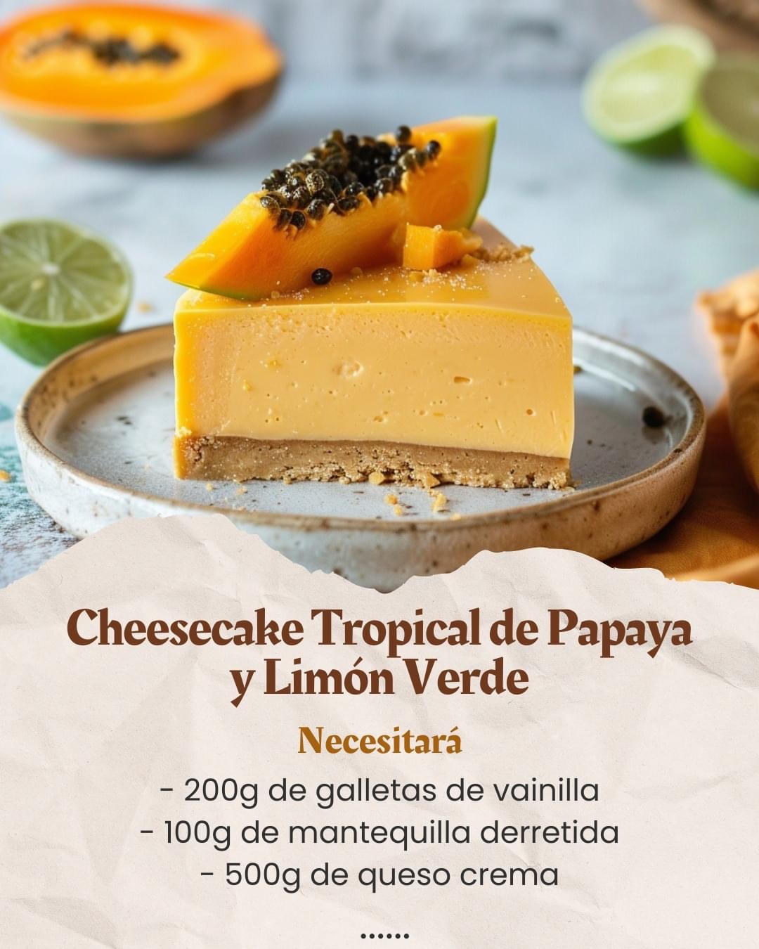 El Cheesecake Tropical de Papaya y Limón Verde es una deliciosa combinación de sabores exóticos que transporta tus papilas gustativas a un paraíso tropical. Este postre, con su base crujiente de galletas de vainilla y su cremoso relleno de queso crema, papaya y un toque cítrico de limón verde, es perfecto para cualquier ocasión especial o simplemente para consentirte a ti y a tus seres queridos.