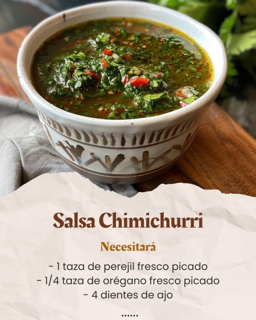 • Conservación: Guarda la salsa chimichurri en un frasco hermético en el refrigerador. Puede durar hasta una semana.