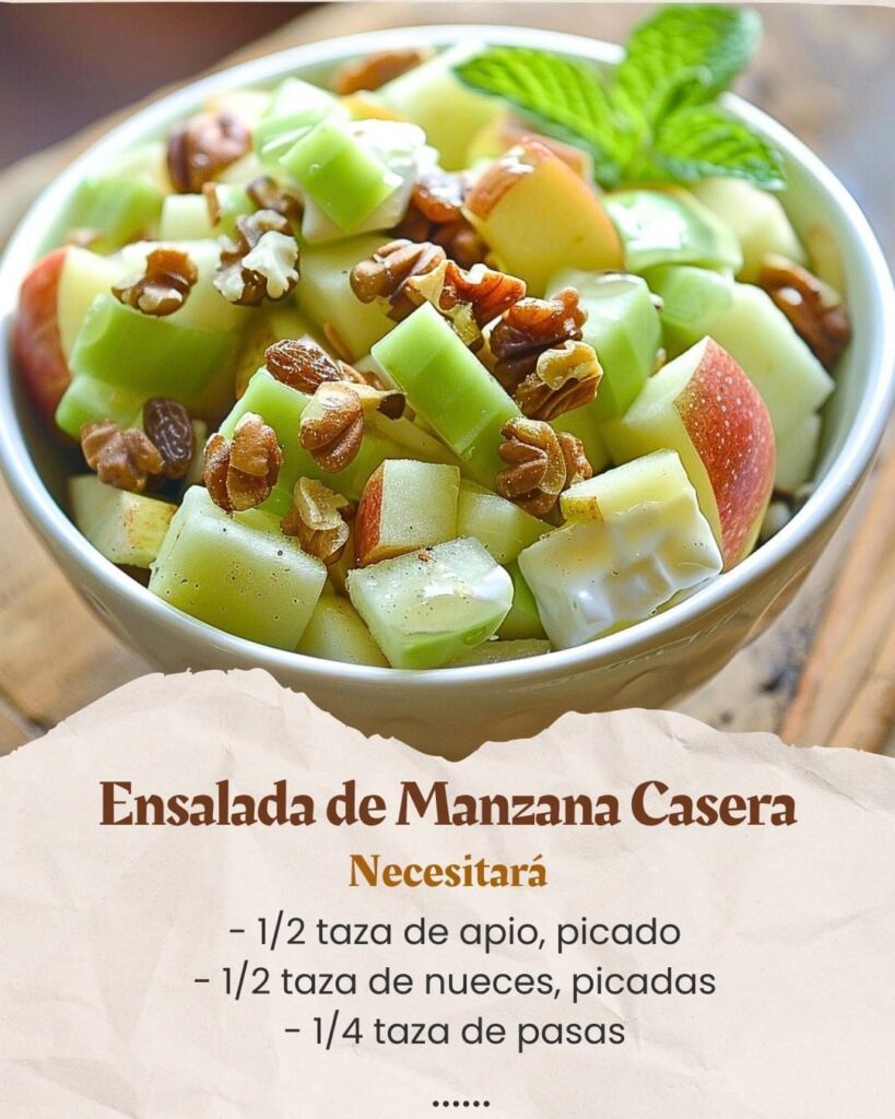 La Ensalada de Manzana Casera es una opción deliciosa y saludable que combina sabores frescos y crujientes con una suave crema de yogur. Ideal para acompañar comidas o disfrutar como un snack ligero, esta ensalada es fácil de preparar y perfecta para cualquier ocasión. La mezcla de manzanas verdes y rojas, junto con el apio, nueces y pasas, ofrece una variedad de texturas y sabores que se complementan maravillosamente. Además, el aderezo de yogur y miel le da un toque dulce y cremoso, haciendo que esta ensalada sea tanto nutritiva como sabrosa.