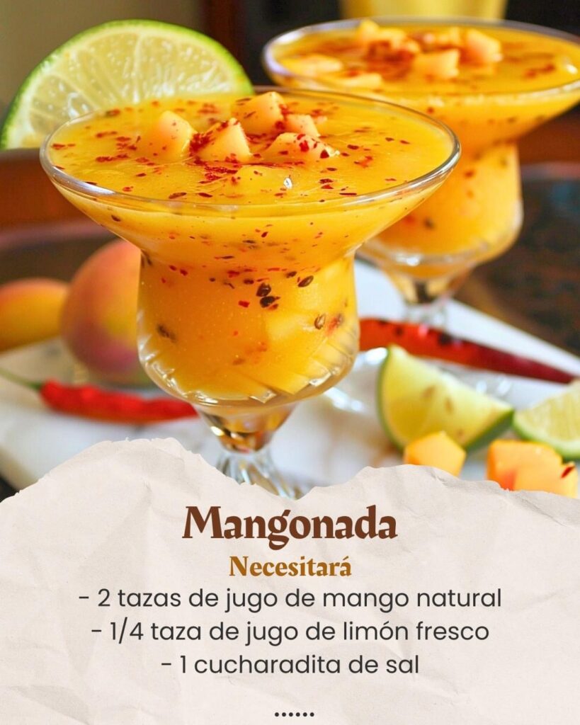 5. Servir la mangonada: Vierte la mangonada en los vasos preparados, dividiendo la mezcla equitativamente.